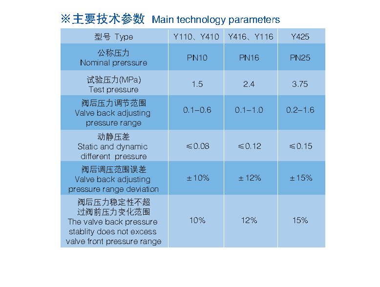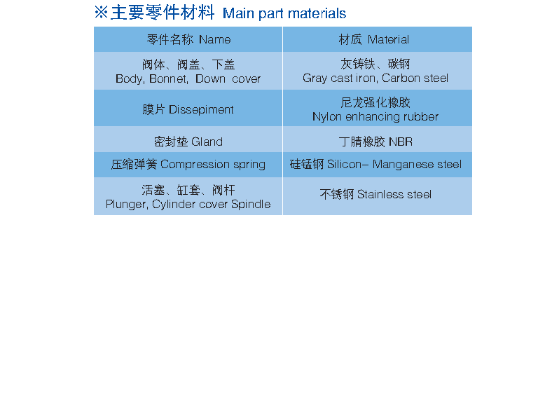 Y110、Y410、Y416, Y425型減壓穩(wěn)壓閥由閥體、閥蓋、壓縮彈簧、閥桿、活塞(膜片)、缸套、閥座及密封墊等零件組成。